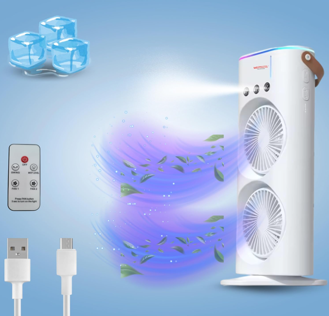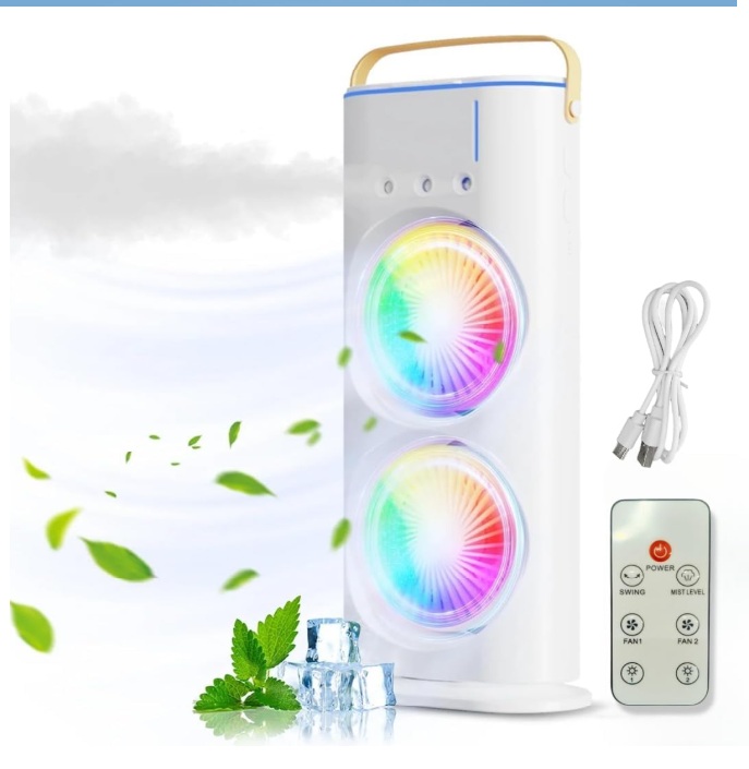 استمتع بأجواء صيفية منعشة أينما ذهبت مع المروحة الرذاذية المزدوجة المحمولة التي تجمع بين قوة التبريد العصري والتصميم الأنيق متعدد الوظائف. تمنحك هذه المروحة تجربة فريدة تجمع بين الرذاذ البارد، توزيع الهواء القوي، تدرجات الإضاءة الملونة، والتحكم الكامل عن طريق الريموت، لترافقك في البيت، المكتب، الرحلات وحتى السيارة.