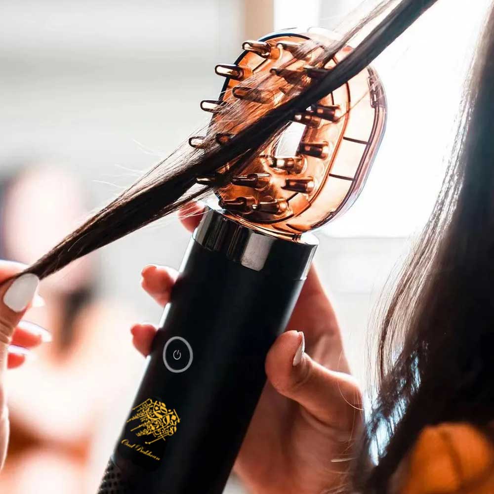 رأس مشط ذكي يتغلغل في شعرك ويوصل الريحة لكل خصلة، ورأس ثاني لتبخير الثياب، العبايات، وحتى السيارة. كشخة كاملة بجهاز واحد. 🌸👗