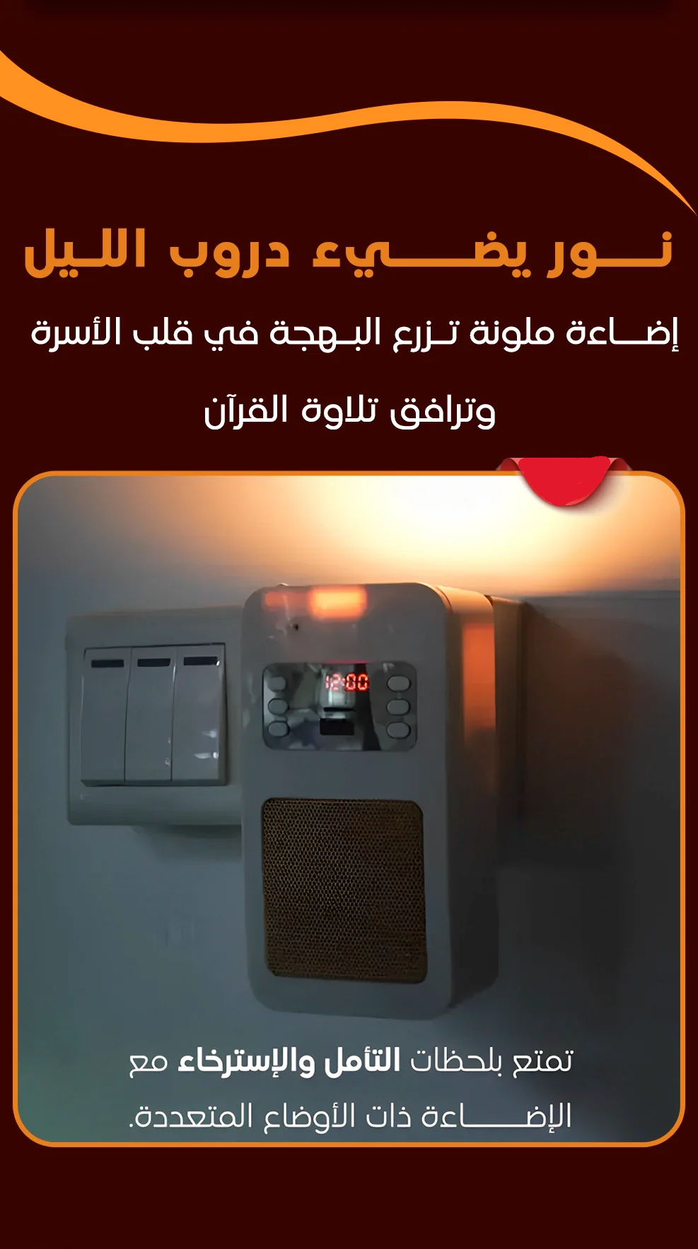 - 🔌 تصميم عملي "اشبك وشغل": تصميم مبتكر يركب مباشرة في فيش الكهرباء الجداري (بدون أسلاك فوضوية)، مع بطارية داخلية تدوم حتى 4 ساعات لتستمر في العمل حتى عند انقطاع الكهرباء أو أثناء التنقل.