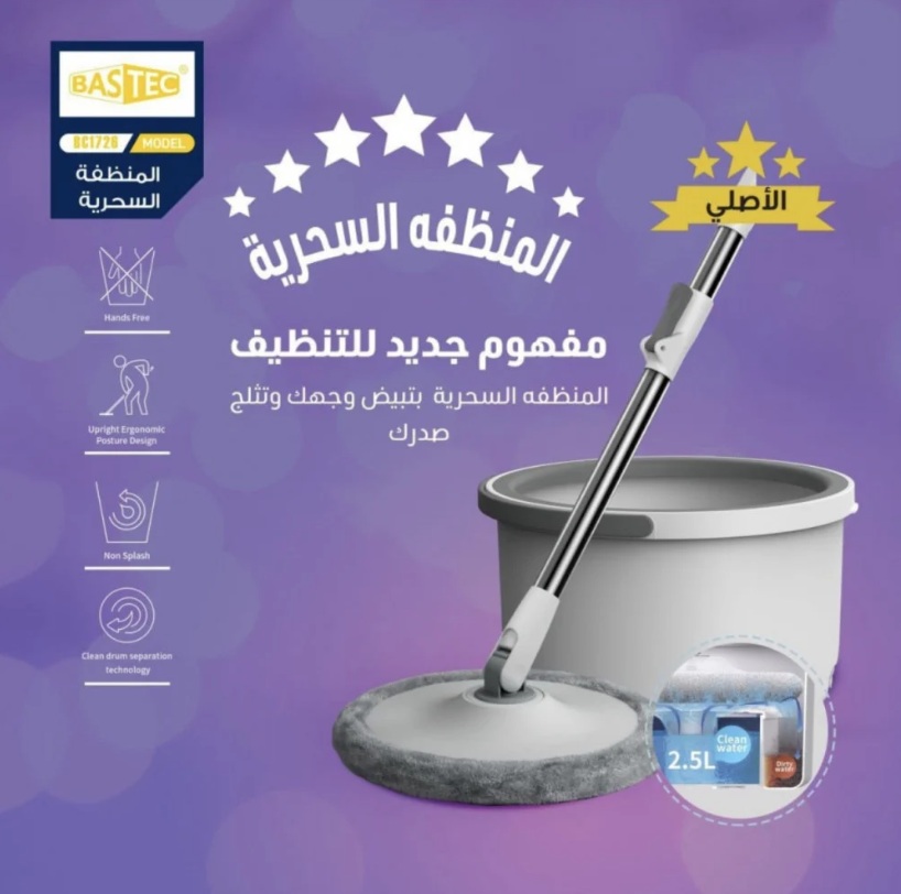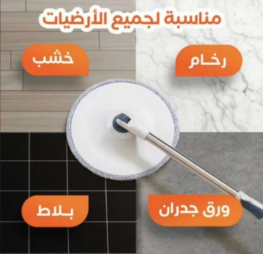 نقدم لك "الممسحة الدوارة الذكية"، الحل الثوري لنظافة فندقية في بيتك! هذي مو مجرد ممسحة، هذا نظام تنظيف عبقري يفرز لك "الموية النظيفة" في خزان مستقل، ويصفي "الموية المتسخة" في خزان ثاني. يعني كل مرة تغسلين فيها الممسحة، تطلع لك موية نظيفة 100%، والنتيجة؟ أرضية تلمع، تعقيم حقيقي، وريحة نظافة تثبت في البيت.